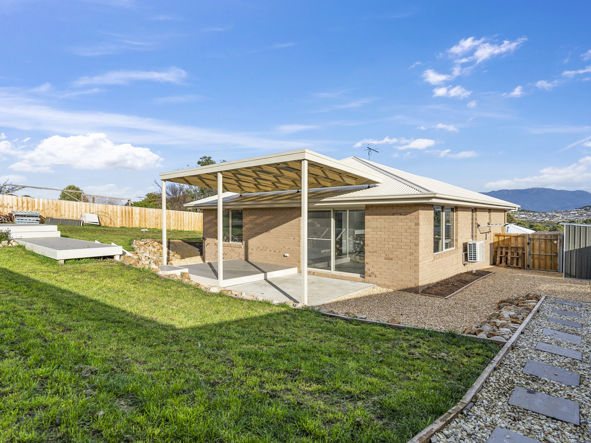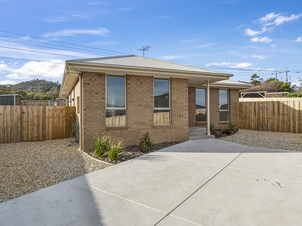 The property includes a shared bathroom with a separate toilet, an internal laundry with trough, and a spacious hallway with a large linen cupboard. The light-filled, open-plan kitchen, living, and dining area flows seamlessly to a covered rear entertaining space. Beyond this, a low-maintenance landscaped yard includes an additional sunny deck with stunning views of Kunanyi / Mount Wellington and a garden shed for extra storage.