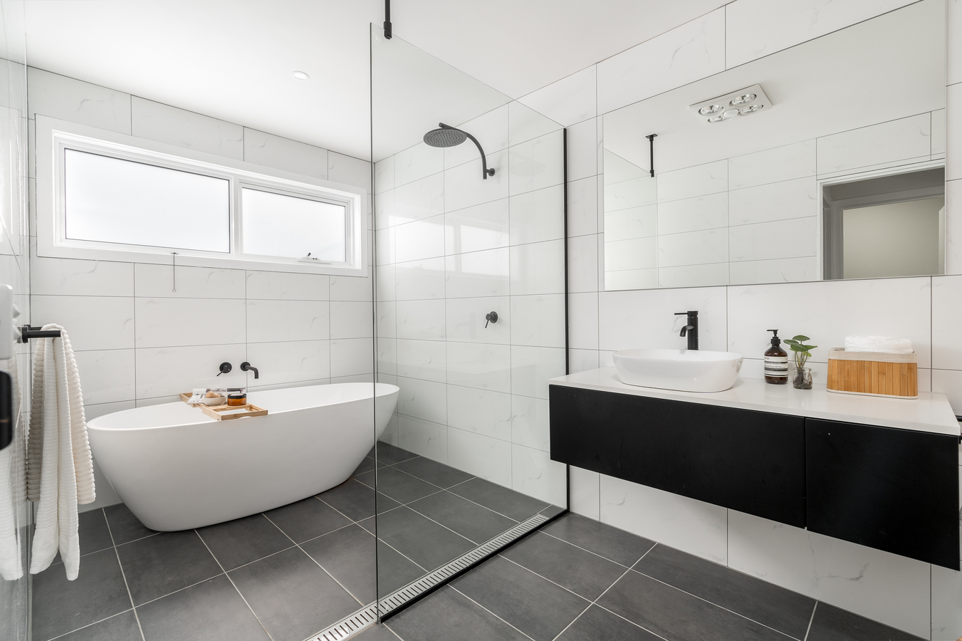 – Main bathroom with soaking tub, walk-in shower, vanity, and heat lamps.