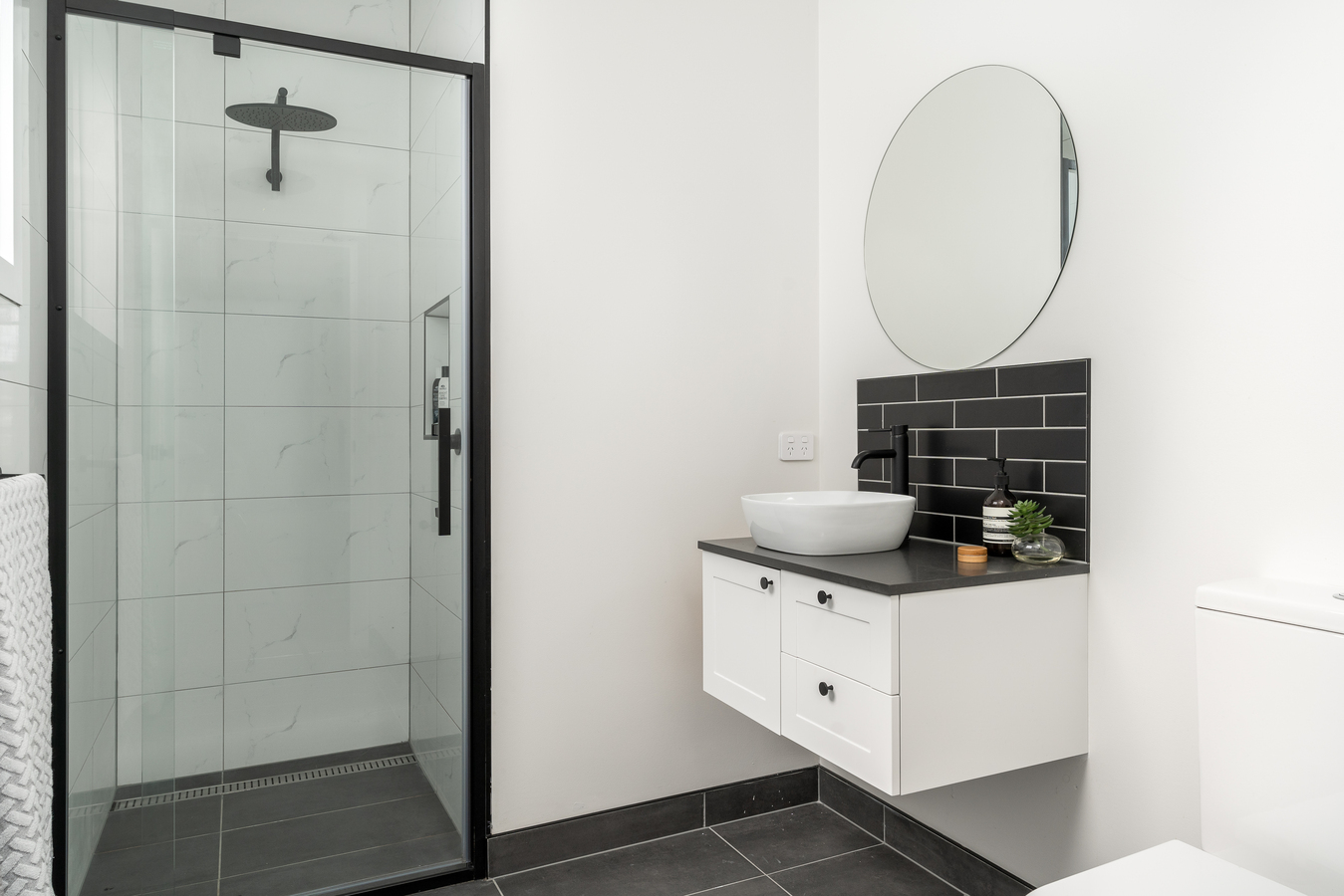 – Master bedroom with stylish ensuite, including walk-in shower, toilet, and vanity.
