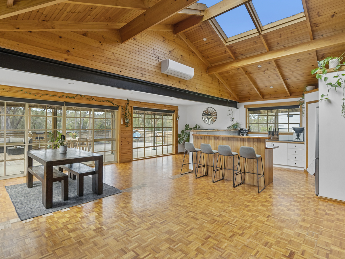 • Open plan casual dining room with heat pump, skylight and outdoor access to deck.