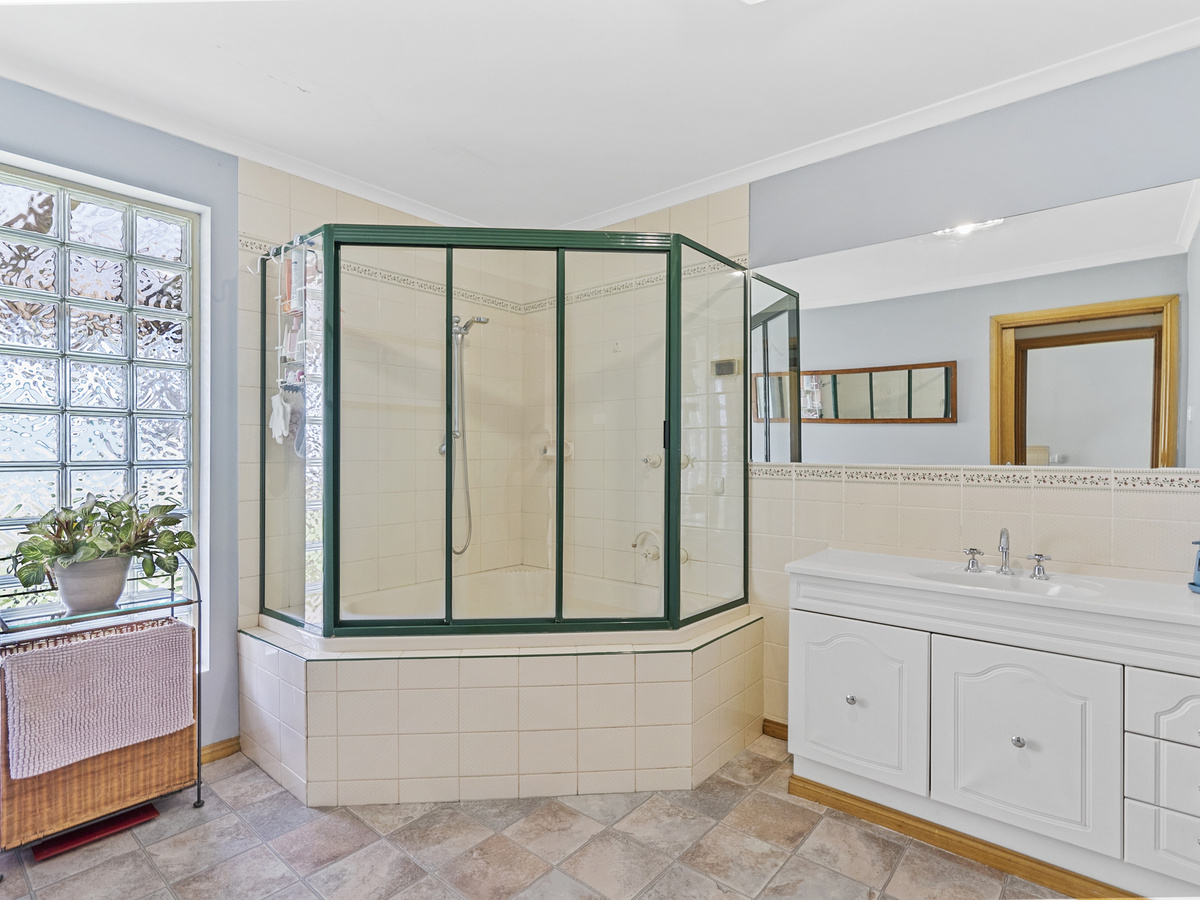 • Bathroom comprises spa bath and shower with vanity and mirror.